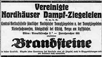 Bis zum 2. Weltkrieg existierten von den mindestens zwanzig Ziegeleien, die in und um Nordhausen am Ende des 19. Jahrhunderts noch tätig waren, nur noch vier. Diese vier stellten sowohl Mauer- als auch Dachziegel in jeweils 2 Ringöfen her: